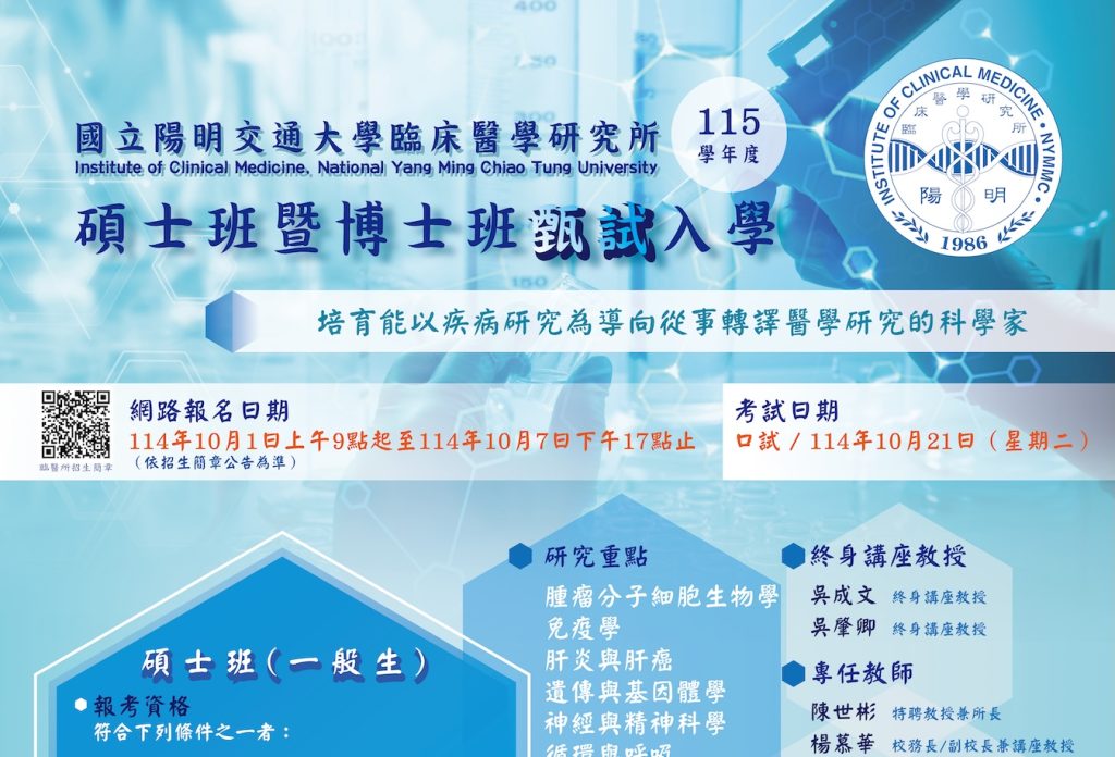 歡迎有興趣的學生來報考臨醫所碩士或碩士在職專班。 網路報名時間: 113年12月10日(二)上午9點起至113ㄡ